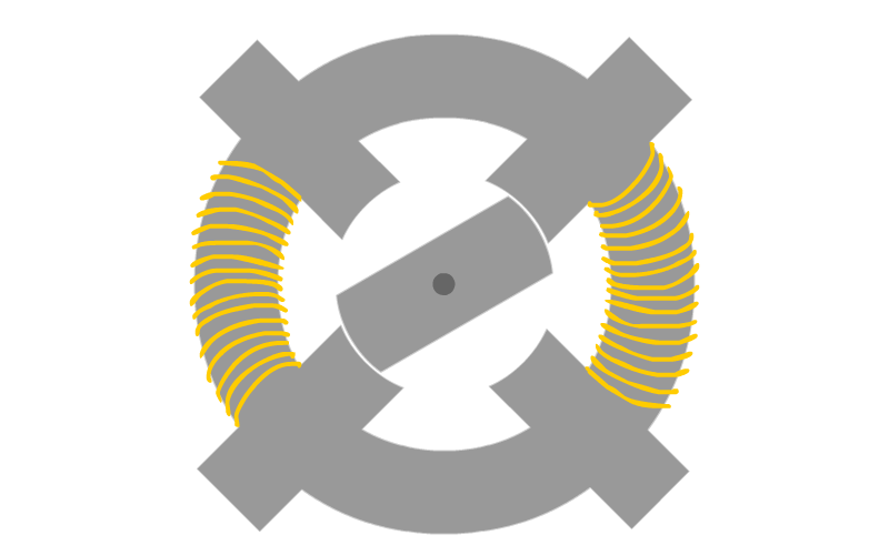因为这样的磁极设定,可以让一个线圈的磁场很容易就可以顺着铁芯,从N极连接到另一个线圈的S极当中(上图黄色箭头),形成一个封闭的磁场,使得变压器得以运作。然而,QEG核心的主线圈,其实并不是一个变压器!这样的磁极设定并不符合QEG运作的原理。因为如果我们将线圈如此设计,当转子旋转的时候,什么事情都不会发生。这时候转子看起来就是一个多余、没有效用的设计。然而如果我们改变绕线的方向,将线圈的磁极重新设计成这样: