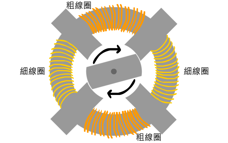 发电机核心,包含了两对线圈,一对是主线圈,另一对是副线圈。主线圈是由较细的漆包线所绕成(各3100圈)。副线圈则是由较粗的漆包线所绕成(各350圈)。这里我们先介绍主线圈的部分(如下图,副线圈已被省略)。