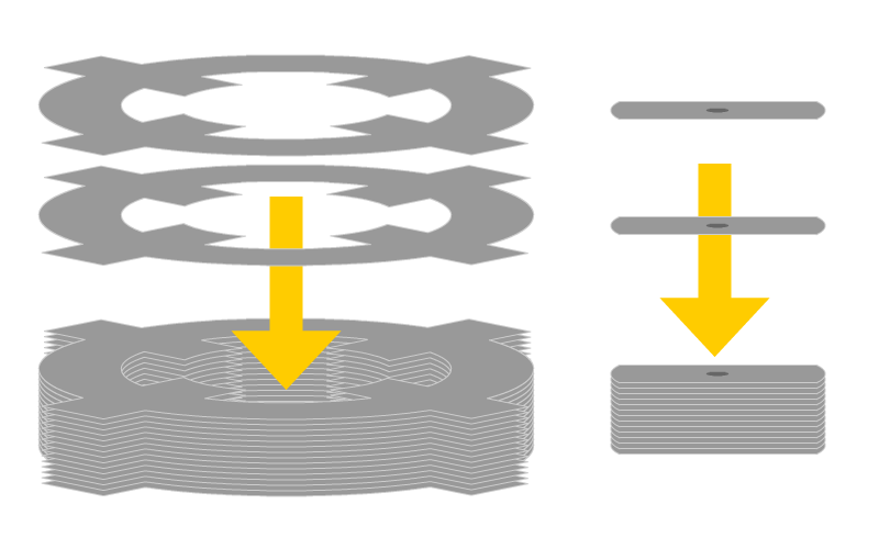 为什么要使用矽钢片叠成核心,而不是使用整块的铁块呢?因为这个发电机的特点,就是它需要透过共振的原理来发电。只有特定厚度与材质(矽含量)的矽钢片,才可以让发电机产生特定频率的震动。如果使用一整块的铁块,或厚度、材质不对,发电机就无法顺利达到所需要的共振频率。