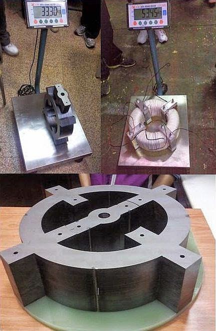这两颗核心,一颗还没绕线圈,另一颗则已经绕好,从图片可以看到,这个核心非常的重!还没绕线的铁芯就有33.3公斤,绕好线并经过绝缘加工后的核心后更达到53.45公斤! (咦…怎么只有左边有放转子…)