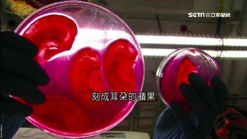 把蘋果細胞換成耳朵細胞,利用蘋果的「纖維支架」讓人體細胞「攀附」而生,最後真的「長出」一隻耳朵。