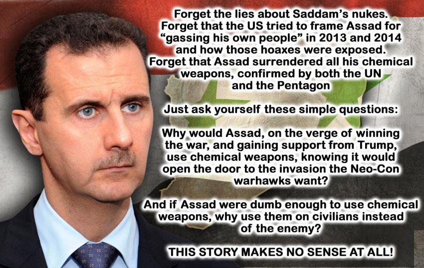 - 既然阿塞德已經勝券在握而且得到了川普的支持,他何必使用化學武器讓好戰的新保守派份子有機會入侵自己的國家?