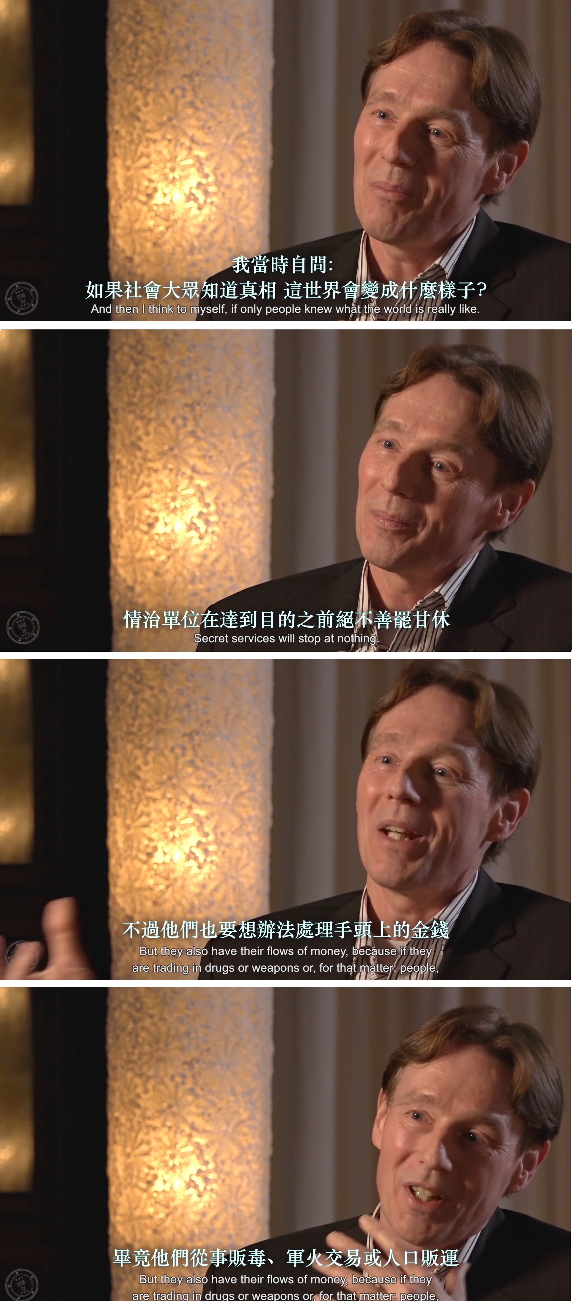 隆納德: 沒錯。我在金融圈認識到我以前不可能接觸到的行業,也就是情治單位。大家以為他們是在保護人民和國家,可其實他們都是犯罪組織。更精確的說,這世界的現行體制基本上就是一個罪惡的存在。這些情治單位都在資助戰爭、煽動戰爭。講白了,他們就是在世界各地製造無數的苦難和衝突。我當時自問:「如果社會大眾知道真相,這世界會變成什麼樣子? 」。