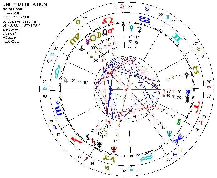 星象圖顯示:位於人馬宮的銀心/土星/莉莉絲、位於牡羊宮的鬩神星/天王星和位於獅子宮的火星/月球交點/太陽/月亮會在冥想當天形成一個強大的天相大三角。這個天相大三角的亮點在於它是個名符其實的大三角形—頂點分別位於赤緯28度人馬宮的銀心、位於赤緯28度牡羊宮的天王星和赤緯28度獅子宮的日/月食。當天日食發生的時候,銀心(佩洛瑪)會發出一道解放的電子火焰。這道會貫穿全太陽系的電子火焰將經由天王星傳導,然後經由日/月食來到地球。這些星體當天都會位於火象宮位。由於地球在日食發生的時候與銀心有著最直接的連結,我們在日食期間的冥想有機會在地表世界形成巨大的突破。