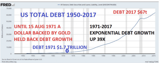 在1913年,全球債務的數量還微不足道,但一直到1971年,都處於穩定增長中。1971年尼克森廢除美元的黃金支持。然後自1971年以來,債務奴隸以指數級的速度發展。就看看美國的債務總額吧,在1971年是1.7萬億美元,但現在已經高達67萬億美元了。在本世紀初,美國的債務也“只有”30萬億美元,也就是說,在過去的16年裡,這個數字翻了一倍。