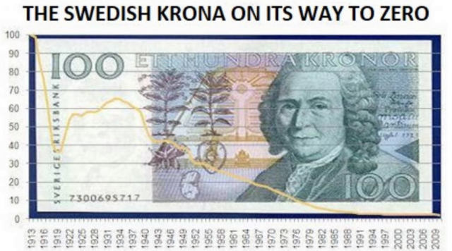 歷史總是在重演。羅馬人在公元180年至公元280年之間經歷了完全相同的事情,當時,羅馬貨幣——便士,其含銀量從幾乎100%最後變為0%。克朗和其他所有的貨幣在過去的一百年裡都失去了99%的價值。只剩1%就要變得一文不值了,而這對包括克朗在內所有貨幣來說都會發生。