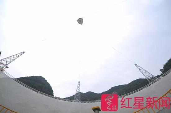 在大鍋蓋的中間,有一個像“大喇叭”的東西,被6根大跨度柔索牽引懸在高空中。這個“大喇叭”叫饋源艙,裡面裝置有饋源,也叫做超寬帶接收機,是FAST接收和回傳信號的最核心部件,整個射電望遠鏡的反射面所接收到的全部宇宙信號,都靠它來收集。