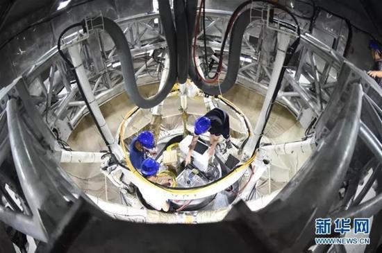 8月10日,工作人員在FAST饋源艙內工作。新華網