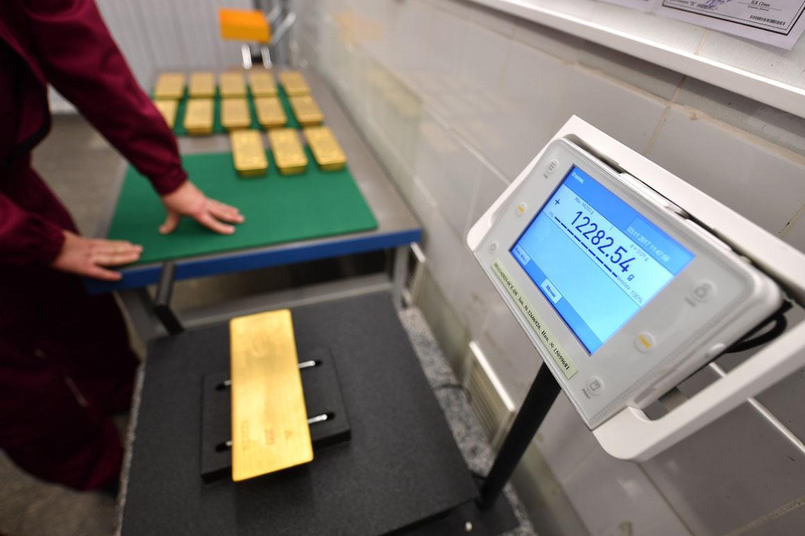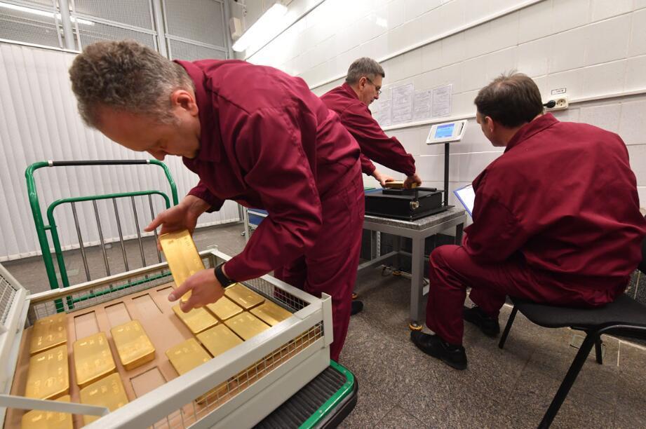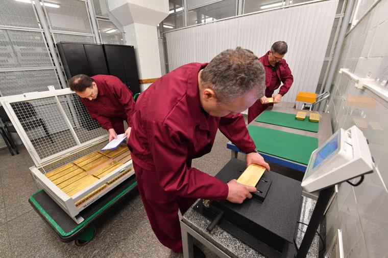 金庫工作人員對金條進行稱重登記。每塊金條重量為12-13公斤,成色則介於99.95至99.995之間,也就是說含金量在99.95%至99.995%,純度非常高。稱重台上都鋪著綠呢絨,就像撞球桌一樣,這樣做是為了防止金條被劃傷。