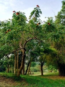 花色火紅的火焰木也開始開花了,枝葉被修剪到已不成樹形的珊瑚樹也開初一樹潔白的小花