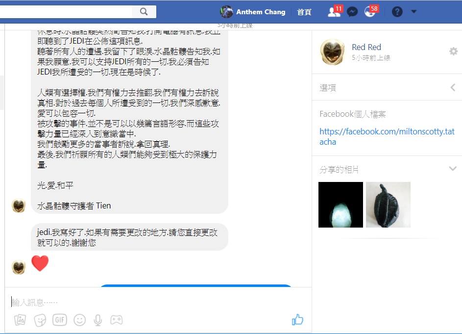 當下水晶骷髏請我打電話給一位光工。告知她所有詳細的情形。在電話最後我說。你們應該知道。我們在同一條船上。你們應該知道,這些話對我的傷害有多大。但我選擇不多說。也請您告知 JEDI。如果他有聽到。看到此類訊息。請幫我澄清。時間會證明一切。我無需再多做解釋。這是將近兩年前。我所遭受到的攻擊。當時我應該是第一個,非常榮幸的被攻擊者公佈的第一位。