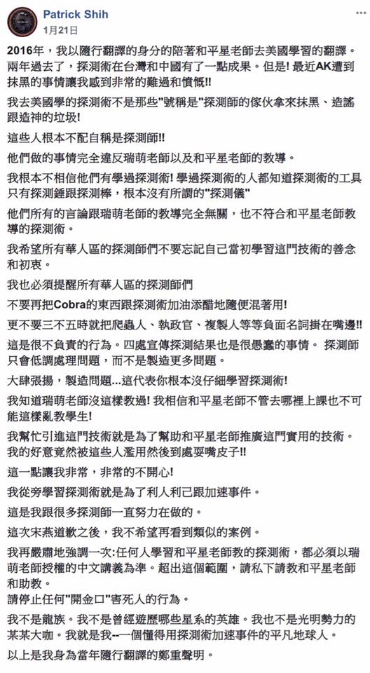 2018年1月,團隊成員和中國探測術學員出現嚴重爭執:一名向林先生學習探測術的學員指稱一名團隊成員是”爬蟲人”。當時我身為兩邊的翻譯,我認為我必須出面維護雙方的關係和探測術的聲譽。於是我在團隊交流區張貼這篇文章: