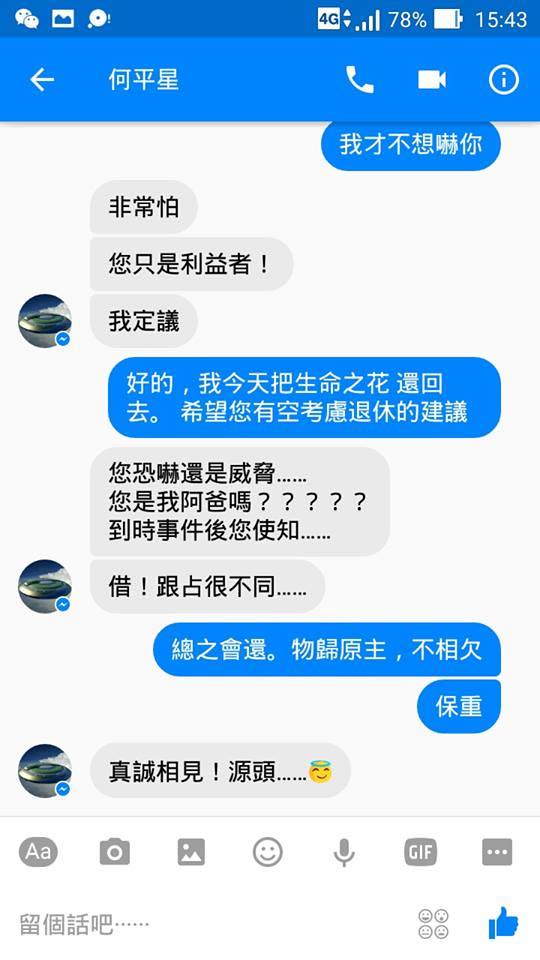 我勸他退休是希望他可以急流勇退,回去當個好父親,好長輩。如果他只是虛應故事,輕鬆帶過,我倒也無所謂。可是! 面對一個替他著想的晚輩,到了最後關頭還願意好言相勸,林先生竟然說我出言恐嚇,還反過來用 “事件” 來反駁我!!! 我和團隊在事件上努力了五年,再加上全世界光工的付出,而且到現在也還在努力的目標。林勝賢先生…… 竟然拿我的核心價值觀威脅我,搪塞我!!!