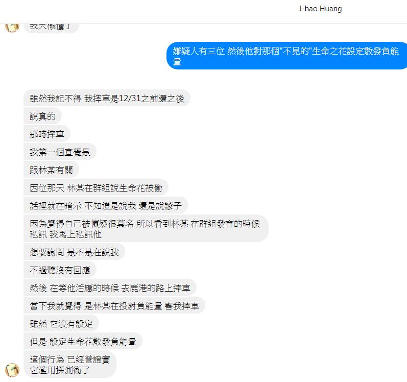 林先生不僅探測術專業不及格,選擇用惡念攻擊無辜人士的行為,更嚴重違反身為身心靈工作者的職業道德。如果繼續讓林先生誤用生命之花,並對此大做文章,這會對其他無辜民眾和學生造成難以預估的負面影響。去年家豪只是自摔擦傷。如果這類事件持續被莫視,這將會違背我幫助林先生引進瑞萌流探測術的初衷。本人在此舉發林勝賢先生的過失,純粹是想釐清團隊與他之間的誤會,並且預防有更多無辜的學生或合作對象,遭受可能莫須有的能量攻擊。