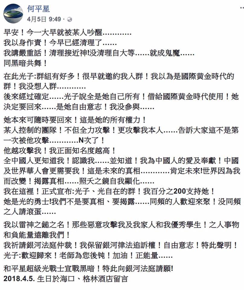 2018年4月初,光子在多個微信群組發起對黃金團隊及工作人員的言語攻擊,以下是我對整起事件的記憶和相關了解: