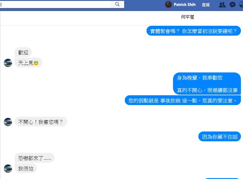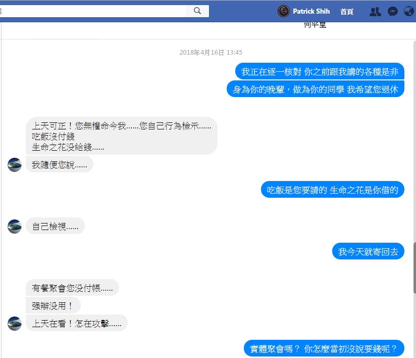 吃飯付帳,天經地義。問題是:我真的事前不知道該付錢。我跟林先生從出發去美國到回台灣開始教課,同個場合用餐的次數超過10次。這些全都是他自願出錢請客,或是我們要討論探測術的公務飯局。至於中區實體聚會的餐點,我在事前或事後都沒有遇到任何人要求我付錢。現在我們的關係鬧僵,林先生竟然小家子氣地跟我事後要錢??? 他真的有身為長輩的自覺和格局嘛???