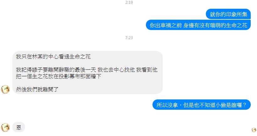 至於他之前借給我使用的生命之花,在此附上它的寄貨證明(報值新台幣3萬元整)以及其他物品的退費證明。退費金額為新台幣1000元整(包括他資助我的:羅技 MK235 無線滑鼠鍵盤組、瑞萌葛瑞斯《四月的季節》和其他雜項開支 )。從此雙方互不相欠,各自珍重: