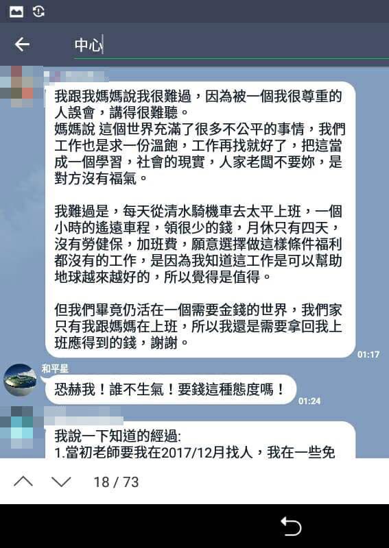 1月17日,我在團隊的中部Line交流群看到林先生為了薪資問題與和平星光養生中心的職員隔空吵架: