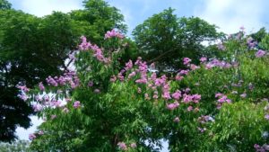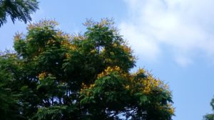 雖然知道今天可能是只有一人參加的實體聚會,還是在官網平台上公布如期舉辦;因為我認為聚會主持人就是要有縱使沒人來參加實體聚會時也要有堅持下去的勇氣與毅力!從停車場步行到林間教室這一路上我看到了已經結實纍纍的茄苳樹已經吸引著白頭翁來啄食了、開著燦爛紫色花朵的大花紫威笑臉盈盈和我打著招呼,抬頭欣賞一下雨豆樹伸展的枝條構成一張美麗的綠傘蔭蔽著路過的每個行人,有著深綠色羽狀複葉搭配圓錐狀的鮮黃花序的盾柱木盛開著一樹的亮黃,莊嚴的站在小徑的一隅;我就這樣一路欣賞著這些美麗植物愉快的走到了林間教室了。