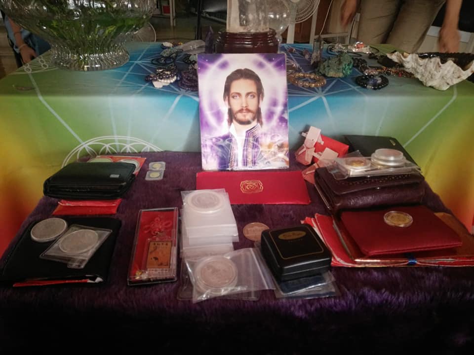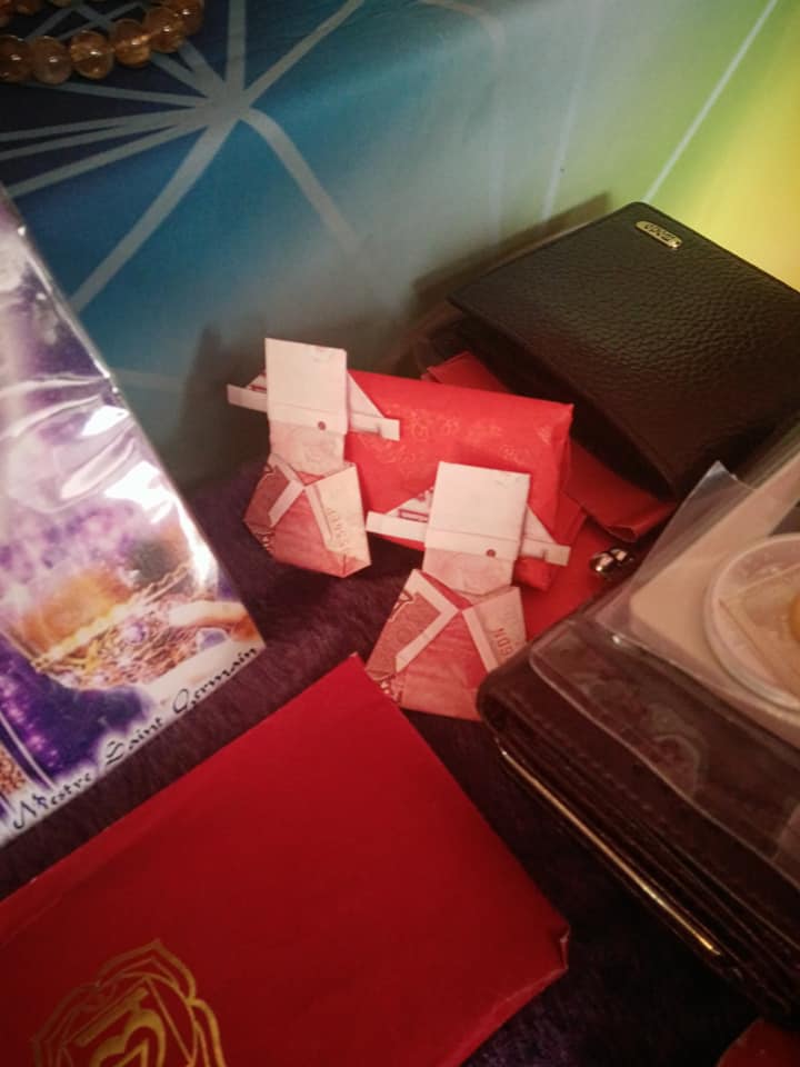 橘子用百元鈔折的財神爺跟著聖哲曼大師一起參與祈福,為中區夥伴們的錢母充飽豐盛能量 XD