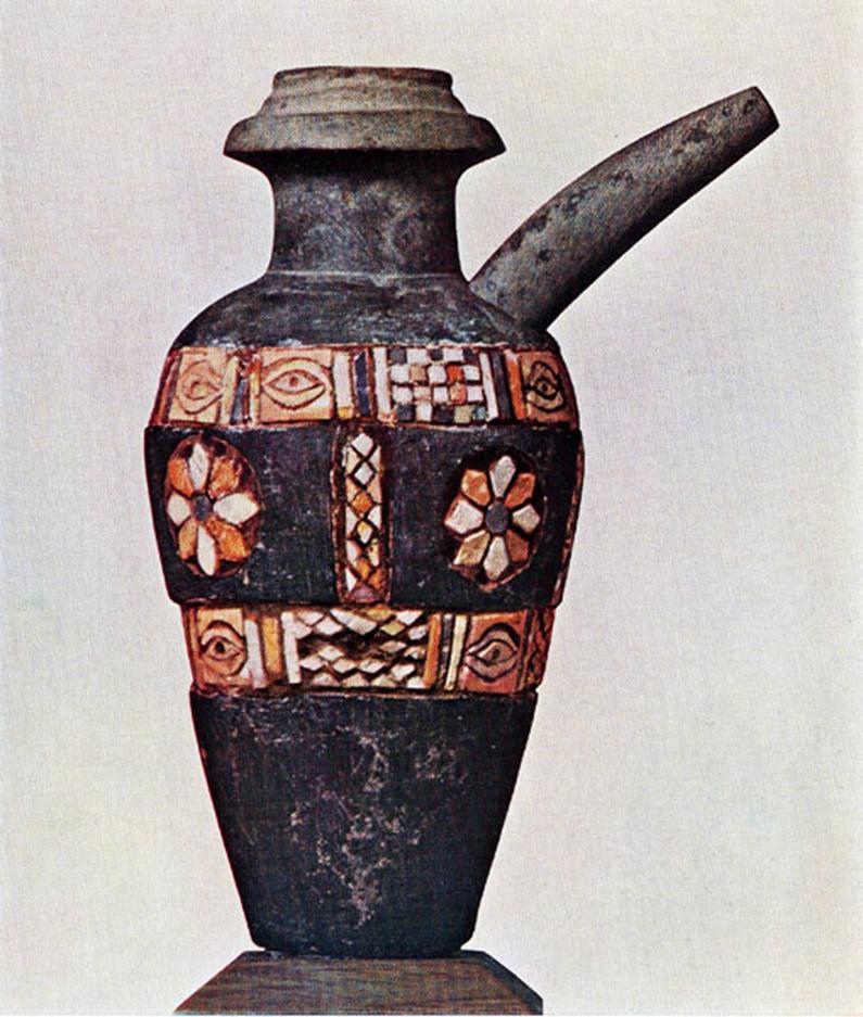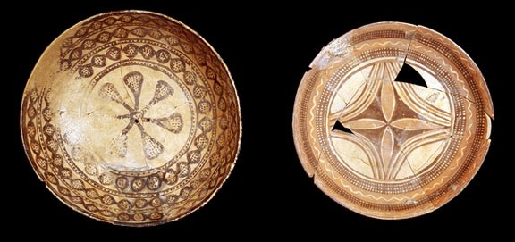 哈拉夫和蘇美爾文明古陶瓷樣品展示。它們都雕刻著神聖男性和神聖女性的面向的圖案。