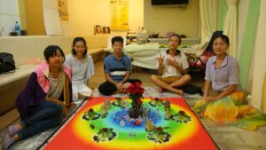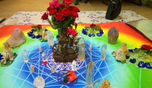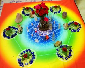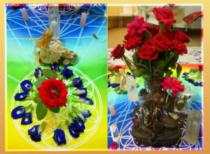 從高雄到屏東聚會場之前,到鮮花批發店買一束佈置聖壇的紅玫瑰(子清委託購買),到了淨心活水堂時街角已經抵達正津津有味的吃著點心,子清怕我餓著肚子,動作很快的炒了一大盤香噴噴的炒飯請我吃,很感動子清的盛情。我們很快的把玫瑰花插好,另以六只漂亮的小玻璃杯呈裝單朵玫瑰分置在聖壇六朵生命之花中,沒多久士鈞和永姿也來了,士鈞帶來自家種的蝶豆花,藍紫色的花朵圍著生命之花排成一圈真是好看。之後大家紛紛把自家的寶珠、水晶佈置在聖壇之上,為了配合今天這個重要的日子,子清特別請出一尊綠度母佛像作為今天的女神象徵,同時在其上放置女神寶珠加強女神能量,一切就緒,時間一到大家就開始冥想,五合一冥想之後就是全球冥想的重頭戲了;一回15分鐘,進行了兩回共30分鐘;人多真的能量就強,這30分鐘感覺一下子就結束了,而且圓滿之後猶有喜悅之感,真的很棒!