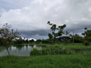 林間教室的平台因為潮濕不適合直接坐下來冥想,我們就改到旁邊的生態觀察室聚會,緊鄰著人工湖的觀察室很通風;一邊可欣賞波光粼粼的湖面,另一邊植有樹幹通直的大葉桉和其他小喬木配上翠綠的草地光看著就覺得很賞心悅目。