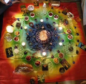 我們抵達時,仁懋已經在卡歐里家了,見到至儒似乎沉穩的驚訝(?)了一下(北區光工相見歡??),接著就是搖滾巫師Jackal熱情大方的和我們打招呼,很快就和大家打成一片了!距離冥想還有一段時間,我們不急不徐地佈置首次使用的阿斯塔陣聖壇─點上蠟燭、摘下庭院裡盛開的蝶豆花、以及可食用的玫瑰與福袋(糖糖帶來的天然蔬菜色~饅頭豆沙包XD)─等等,晶礦在燭光閃爍之中美得神聖…。