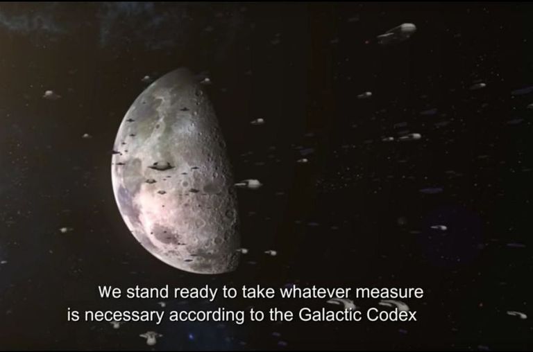 (註:Cobra隨即用右手拿著一顆水晶球,代表地球。三公尺外的聖壇則是代表月球。 接著他把左手小拇指放在水晶球上幾公分的位置,代表現在艦隊的位置)