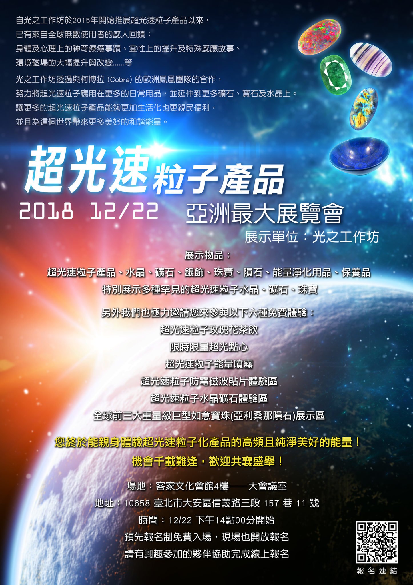 為了讓更多人能夠現場感受到超光速粒子的美好,我們特別籌備了一場超光速粒子的世紀大展覽,除了將會展示在光之工作坊上架的產品之外,你還將會看見各式各樣從未見過的超光速粒子化的奇珍異寶!你可能聽過各式各樣的寶石、水晶,但你可能不曾親身體驗過超光速粒子化的寶石帶來的生命力與美好能量,現在這個機會即將在12/22這一天到來!邀請您與我們一起共襄盛舉!