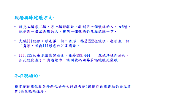 3、1月21日冥想前的正午12:00點,我們將於YY現場帶領各地區所有實體聚會的人們進行松果體(三眼輪)三角連結冥想,讓冥想的共振力量發揮到最大強度。
