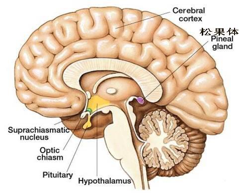松果體差不多在大腦正中央,這是頭、眼睛、松果體就在腦袋正中央。