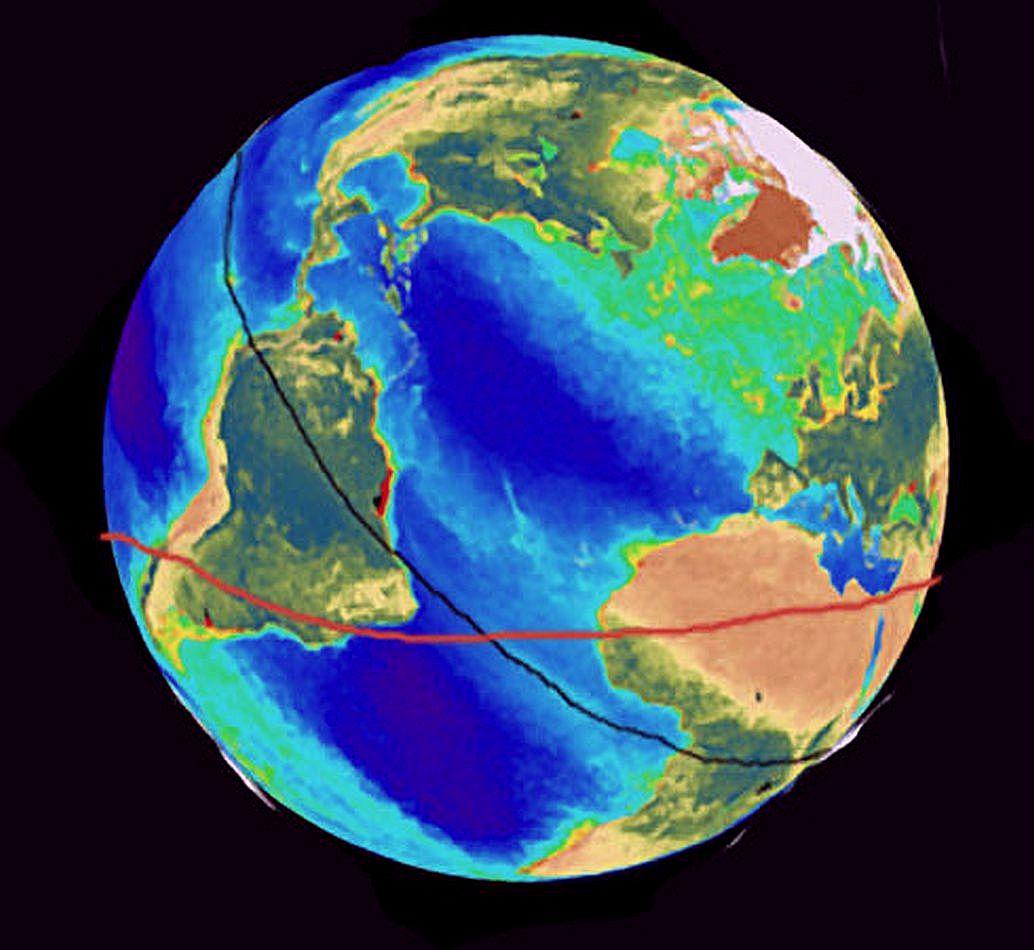 兩個赤道,深藍色是地球現在的赤道,現在上面白色的區塊是北極,舊亞特蘭提斯時代的赤道是紅色那條線,那時北極在阿拉斯加附近,以前亞特蘭提斯赤道會通過馬丘比丘、庫斯科,也通過亞馬遜三角洲(當時亞特蘭提斯就在那邊沉沒),也通過吉薩大金塔群,也通過約旦的城市、通過伊拉克,也通過泰國清邁。我明天會講些關於清邁的事情,還滿重要的。