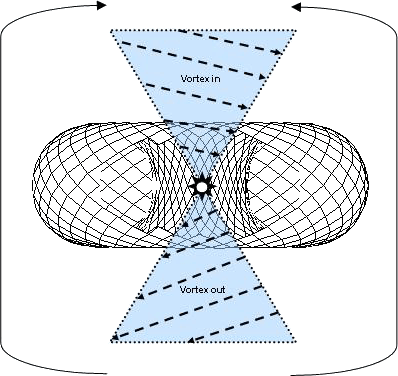 這個雙螺旋轉化逆變漩渦會形成撓場在周遭旋轉,當這個撓場用光速逆轉的時候,就會揚升,就不存在三維實體世界了,這就是我們未來有一天會發生的事情。