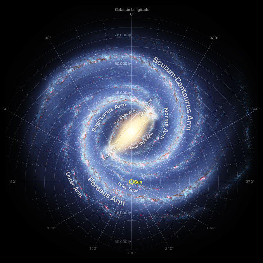 這張圖是我們的銀河系,我們夜晚出去看星星時候,夜晚看到的星星都只在那個黃色圈圈裡面。