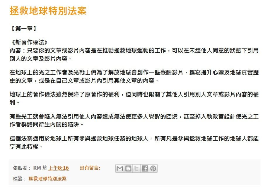 內容:只要你的文章或影片內容是在推動拯救地球運動的工作,可以在未經他人同意的狀態下引用別人的文章及影片內容。