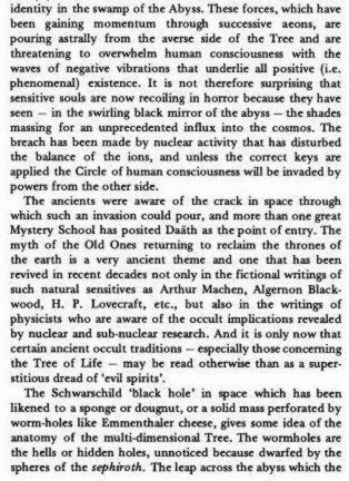 譯註:人類在二戰之後的核子試爆實驗干擾了離子之間的平衡。來自宇宙深淵的遠古長者們可能透過知識直點入侵人類意識的世界。人類的意識可能會被大量的負面振動頻率淹沒。克蘇魯神話的作者們是一群第六感敏銳的作家。他們感受到來自另一邊的東西是多麼可怕。