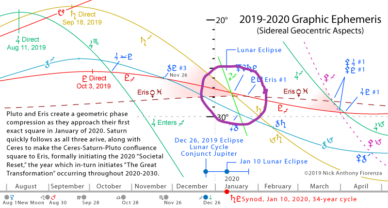 2020年1月11日 土星-冥王星在摩羯座22度合相而且跟太陽、水星以及穀神星緊密合相、半影月食、天王星和鬩神星順行