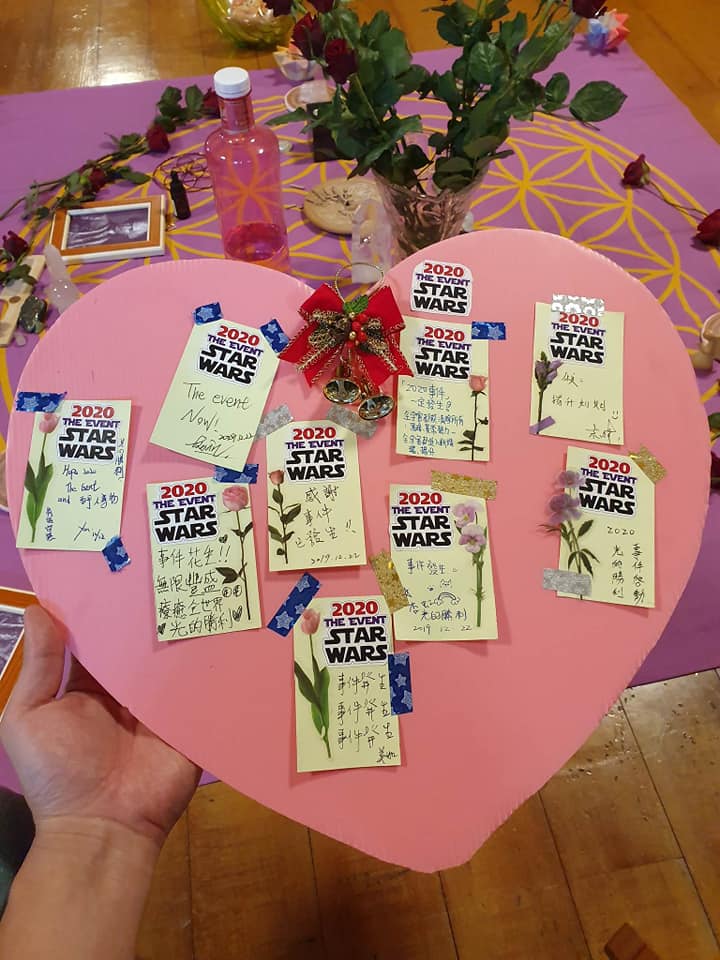 2020 THE EVENT STARWARS卡片設計者構想:與星戰電影互相呼應,從宇宙有黑暗勢力產生以來,光明與黑暗勢力的星際大戰一直開打至今,從仙女星系轉到了我們的銀河系,(最近非常振奮的好消息:只剩我們地球尚未解放,月球已經屬於光明勢力了!?❤️?),而這已經是銀河戰爭中的「終局之戰」,基於這些我們非常期望2020觸發事件,所以設計了這個LOGO。卡片貼上花朵則象徵女神能量以及女神回歸。空白處讓大家寫上相關事件的心願,並貼在應景的聖誕心願板上,希望光明勢力能收到我們想在2020觸發事件的強烈心願! 有些帶回家寫或是沒參加的伙伴,能在下次聚會與大家一起分享。