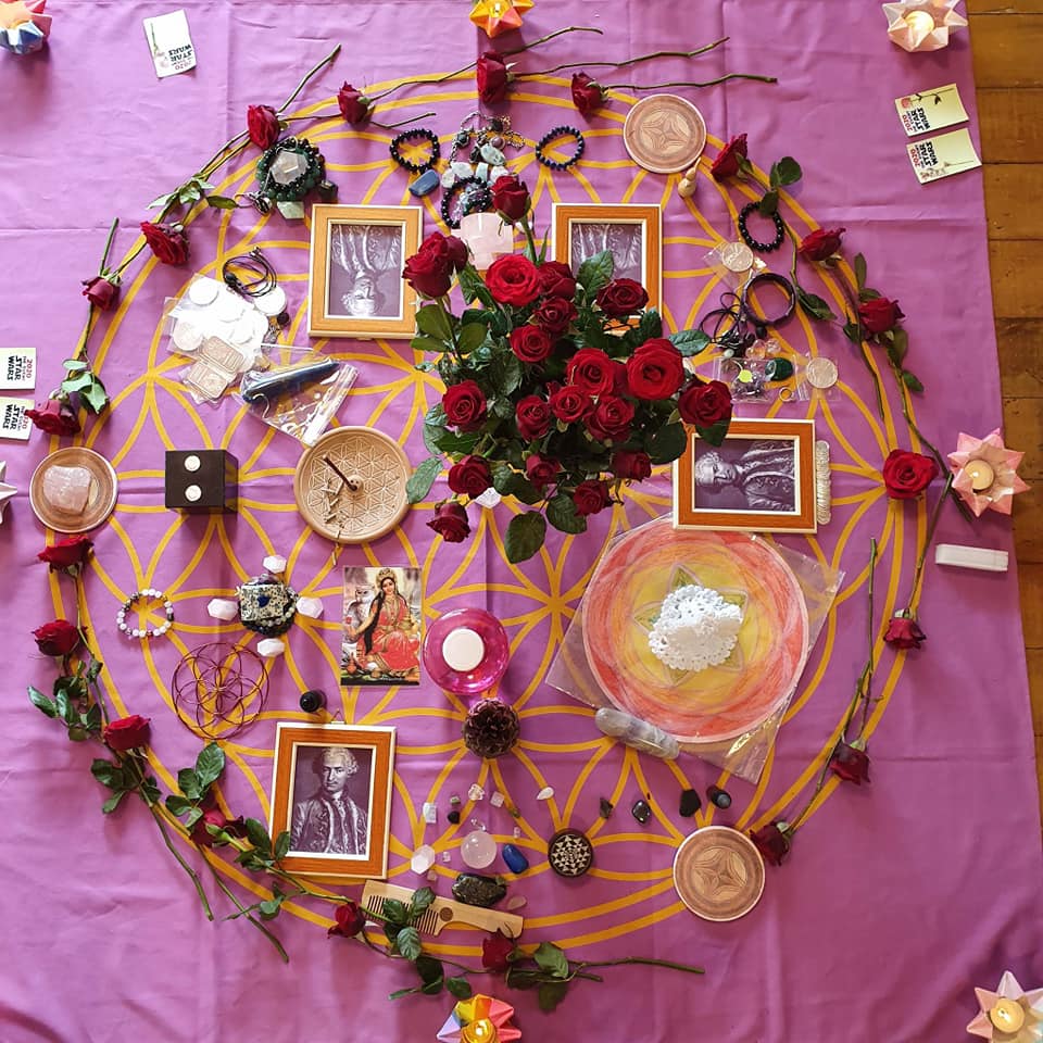 看完電影,大家一起圍成更大的圓圈冥想,人數比預期的還要更多,因有第一次來參加或是參與不久的新朋友。聖壇布上最近多了很多最能與聖哲曼大師連結的18世紀肖像,還有很多的白銀,象徵豐盛還有大家不斷加深與聖哲曼大師一起在能量上的作業,尤其是在最近的金融體系相關的冥想。