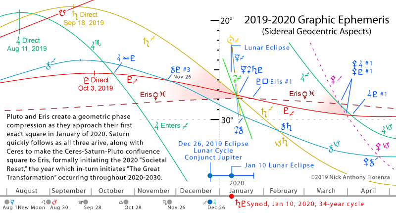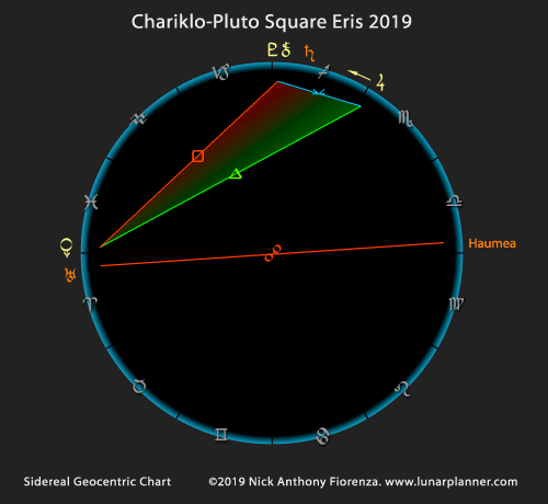 2019年3月冥王星與鬩神星的相互接近只有一度差的地心四分相,月球交點也在冥王星與鬩神星四分相的相位,此時南交點的計都星也與一同加入的冥王星會合,同時女凱龍星也同樣會合冥王星,這是因為計都星從魔羯宮進到晚昇的射手宮歲差,月球北交點的羅喉星歲差也進到晚昇的雙子宮後會合北河三(雙子座β星;善辯的雙子座大使)。然而還有特殊不凡的羅喉星-計都星和女凱龍星合相,北交點同樣也與鬩神星畫出一個T型三角,兩天體成對相,與另一天體與二行星皆成的四分相位,此星相開始了長達數月的加速變革!