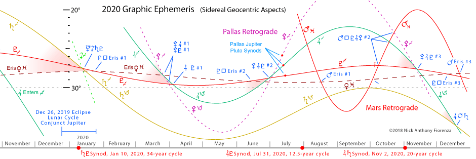 以日心占星四分相的角度來看,它劃定出冥王星-鬩神星實際週期是在2020年8月,兩顆天體會在2020年始終保持在3度的容許度裡,冥王星-鬩神星在2018年進到3度的日心四分相,從2020年1月到2021有幾項精準的地心四分相,和緊跟著在2021下半年出現由來已久、完整的四分相位。