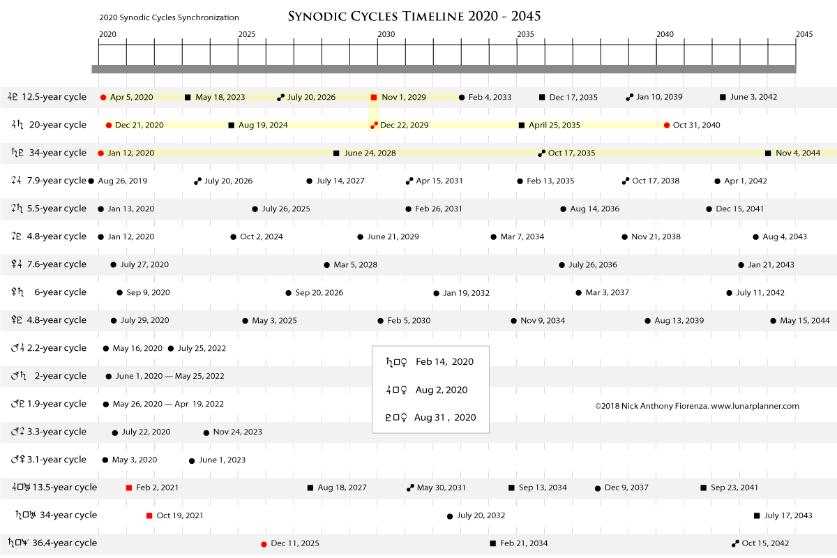 木星-天王星新的13年5月的新週期循環將開始於2024年3月14日,新的土星-海王星36年4個月的循環將在2025年12月11日地球歲差的春分點上,這是一項非常重要的星象,因為它很接近土星-海王星在1989年開始的44年期的循環。詳情請參閱2016-2020自我意識與社會政治的探索 這兩個過渡天象運動,會為“偉大非凡的轉變”帶來更進一步、更多的大規模形成的力量,貫穿整個2020年。