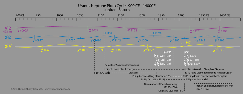 有趣的是法王菲利浦六世(1268-1314) 透過與統治納瓦拉的皇后-瓊安一世的聯姻,最後在西元1284年成了菲利浦一世的納瓦拉國王。這個時間點就落在上次木星、土星、冥王星的三星匯聚,同時也發生天王星與冥王星的對相。那年正是菲利浦指控和下令追捕聖殿騎士團,讓他們在1305年全軍覆沒的時期。也是木土合相、天王與海王星合相的時間。(參閱下方圖表時間線)