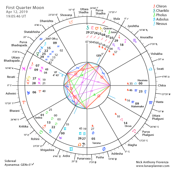 月亮週期的上弦月開始時,會刺激和鼓舞著我們外在的動力,然後才進入到落實付諸行動的象限月週期。這樣精力充沛、充滿變化的期間會在4月12日晚昇的雙子宮,太陽和鬩神星在對相的妊神星和月交點四分相的位置上,與土星、女凱龍星、計都星會合,同樣也與月亮、羅喉星會聚。木星一樣對準天蠍座的尖刺尾部,側相到婚神星、從上帝的手指相位合相妊神星,(又名YOD,意思指三顆行星組合成一個等腰三角形,三顆行星中的兩顆成60度)到對相到水星和賽德娜星。