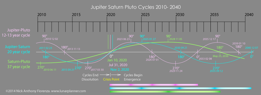 上一次的十年週期的結束與2020年的全新循環,具有非常重大的意義,因為這個與冥王星的合相會發生主要的社會重置,木星-土星和冥王星的三星合相,新的相位週期都會發生在2020年,這將會為人類社會注入一股勢不可擋的進化轉變的能量。