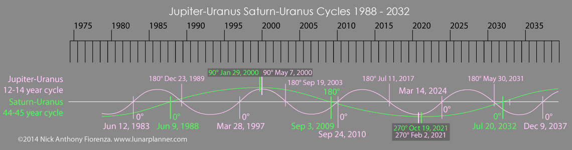 土星-天王星的週期循環開始於1988年,位相落在射手宮的神之門,土星與海王星也同時進入36年4個月的週期(這個週期會在2025年結束)。