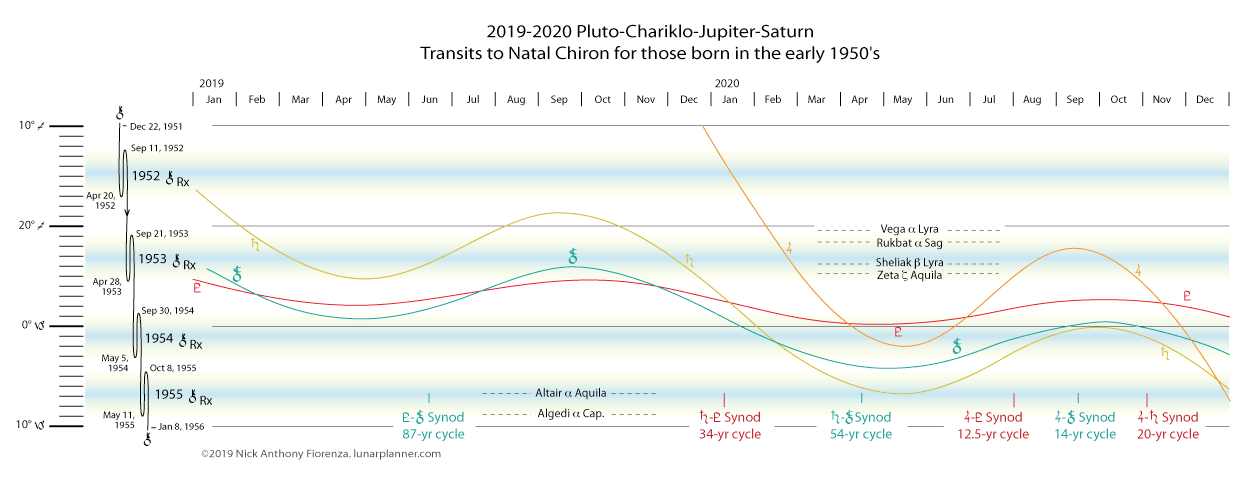 半人馬座、女凱龍星和冥王星在射手宮合相,和與鬩神星穿過2019年在雙魚宮成四分相,此星象在2019年裡創造出最驚喜巨大的能量之一,儘管女凱龍星和冥王星在6月前不會開始為期87年的新循環,而地心三次確切的合相發生在2019年的2月16日和7月24日、11月26的逆行。這個特殊的相位在冥王星在南交點的射手宮晚昇,非常靠近冥王星-女凱龍星軌道換日線(兩天體相交軌道的節點)通過黃道約5°的位置。
