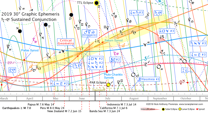 2019年7月中旬的會合相位劃分出地球-冥王星-女凱龍星年度的合相,和地球-冥王星在2020年7月的周年合相,此星位非常靠近女凱龍星-冥王星87年期在射手宮的合相位置,地球-冥王星兩次的合相周年期,起始於2019年7月到2021年7月,女凱龍星-冥王星87年的循環週期,深植影響到行星地球的許多層面。