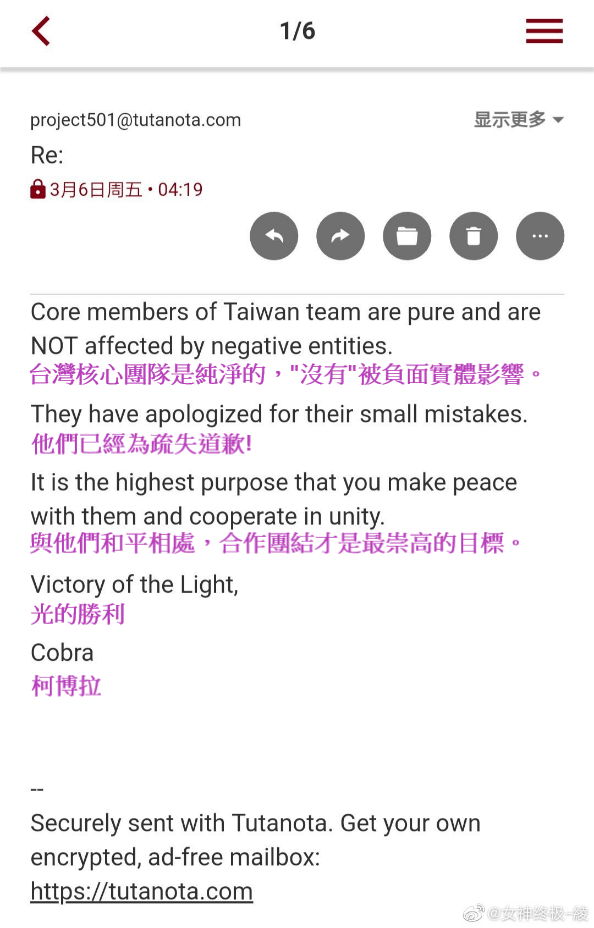 台灣核心團隊是純淨的,”沒有”被負面實體影響。